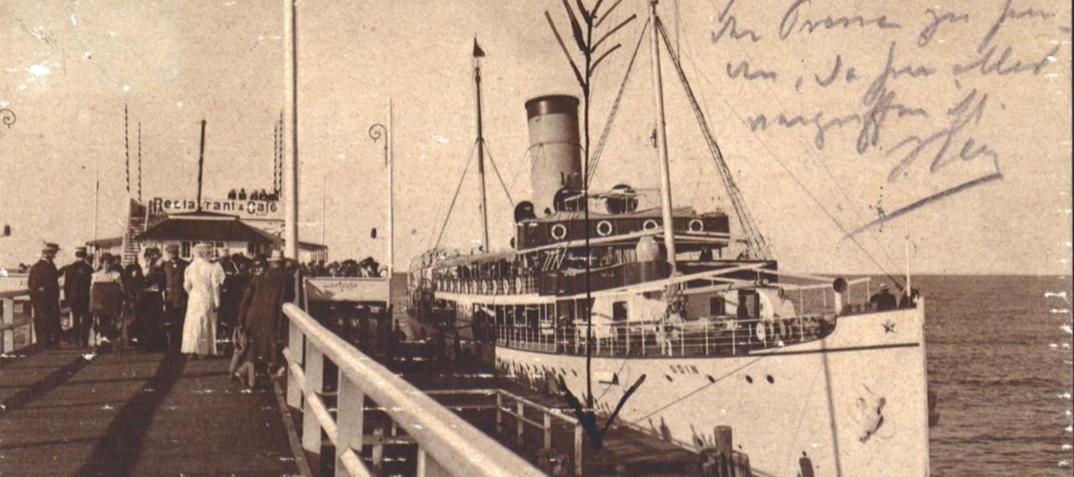 Auf der Seebrücke herrscht reges Treiben. Auch am Abend flanieren noch hunderte Menschen über die Promenade und auch über die Seebrücke. Sie beobachten die Passagierdampfer, die an- und ablegen, oder schauen hinüber zu den Kriegsschiffen der kaiserlichen Marine, die etwas abseits vor Anker liegen.